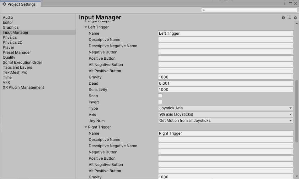 이번에는 positive button 이 아닌 Axis 에 매핑이 되어있다 왼쪽 오른쪽 각각 9th Axis, 10th Axis 으로 매핑되어있다.